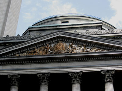 The north end of Place d’Armes holds another architectural marvel: the Bank of Montreal building. Founded in 1817 as the first bank in Canada, the Bank of Montreal decided to build an impressive headquarters in 1847 and created a neoclassical exterior modeled after the Roman Pantheon. The interior was completely redesigned in 1904 to 1905 by the famous New York architectural firm of McKim, Mead and White with a magnificent banking hall modeled after a Roman basilica.