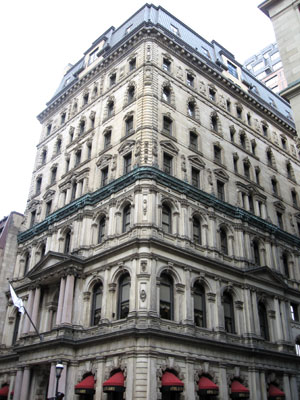 We then stopped to admire Place d’Armes, right in front of the Basilica, so called because it used to be a location for military manoeuvres as well as for religious processions. Place d’Armes is a veritable collection of architectural history. The New York Insurance building, dating back to 1888, was the first building to install the newly invented elevator, at the time making it the highest building in all of Montreal. The Hotel Place d’Armes just north, originally five stories high, actually had three stories added once the building was retrofitted with an elevator.