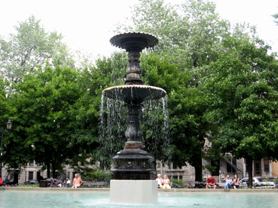 The centre of the park, situated in Montreal’s popular Latin Quarter neighbourhood, features a classic Victorian fountain, surrounded by a large number of benches that attract local residents, university students, artists and tourists in search of a shady spot to relax. Someone had brought a guitar and was strumming folk songs, children were playing, and a dog was swimming in the water of the fountain. A peaceful atmosphere imbued this urban green space. Surrounding the park is a collection of eclectic Second Empire townhouses and some people say that this square might be the closest thing to a European neighbourhood square.