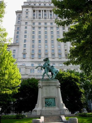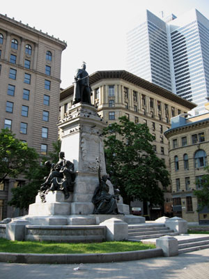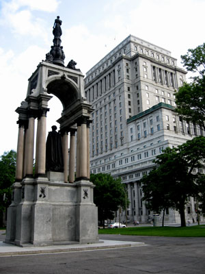 I continued west past increasingly modern buildings until I happened across a major urban square: Dorchester Square, formerly known as Dominion Square. This wide open public space is a former cemetery which held the victims of the 1832 cholera epidemic. Today it holds several statues, including a monument commemorating the victims of the Boers War, a statue of Robert Burns – a Scottish poet, and another statue of Sir Wilfried Laurier, a former Canadian prime minister.