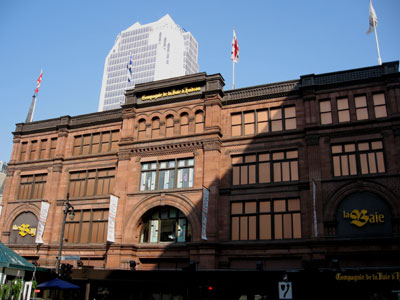 I continued to walk east on St. Catherines and happened upon Phillips Square, a beautiful urban space where the retail trade began in Montreal. Rue St. Catharines had formerly been a purely residential area. Henry Morgan, a Scottish immigrant with excellent connections in the dry goods retail trade in Glasgow, had moved a retail store to a new location at St. Catharines and Phillips Square after the old city , location of most of the retailers warehouses, had suffered a devastating flood in 1886. This store, built in the solid Richardson Romanesque style, later became “The Bay”, for the “Hudson’s Bay Company”, which is a chain of about 100 fashion department stores operating throughout Canada whose origins date back to the fur traders of the 1600s. The centre of Phillips Square is home to a monument of King Edward VII, and a Birks jewellery store, located in an attractive sandstone building, flanks the square on the west side.