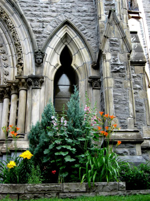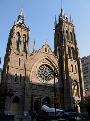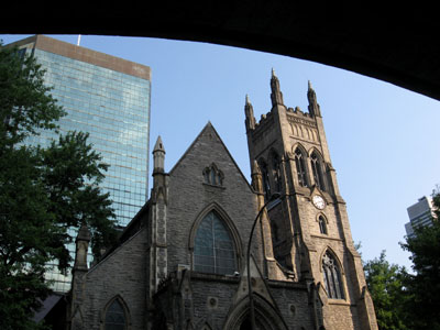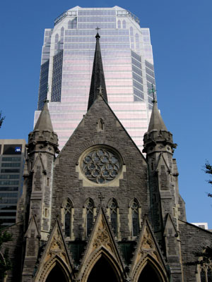 This street also features a wealth of historic buildings including Christ Church Cathedral. This impressive Neo-Gothic church was built in 1858 and consecrated in 1867 in the growing Gold Square Mile area. The architect Frank Mills used the cathedral of Salisbury, his home town, as a model for this building. The church features a beautiful stained glass window and surprisingly, the church itself rests on the roofs of an underground mall. Prior to the construction of the mall, the church was actually sinking into the soft ground. Indeed the original steeple had to be removed in 1927 due to its heavy weight and a much lighter steeple made of aluminum was constructed in 1940. Today the underground shopping centre, whose 1987 excavation required the church to be supported by concrete beams in mid-air, provides adequate structural support for the church. The 34-story office tower behind the church is topped by a crown of thorns and makes for a popular photo motif.